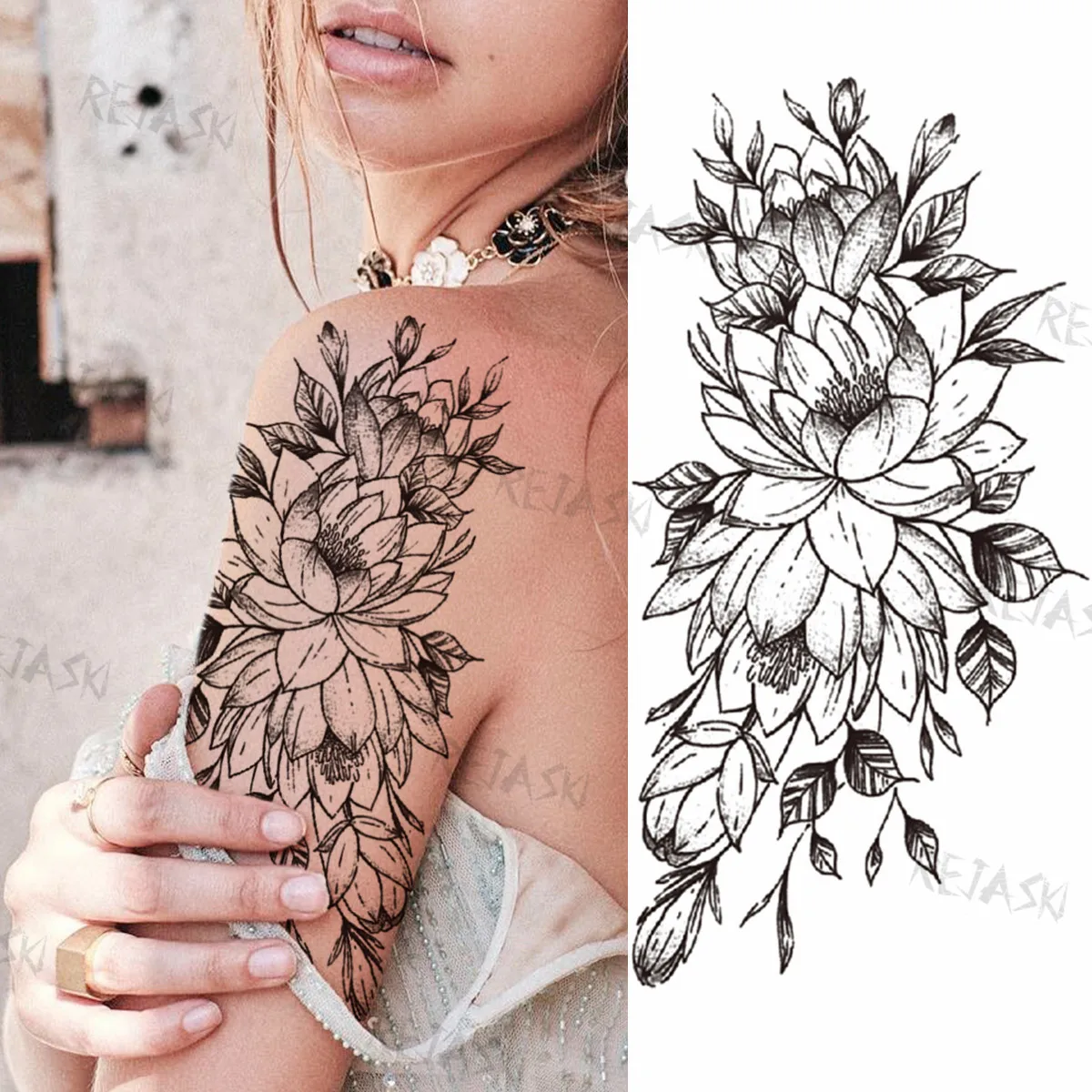 קנו קעקועים ואמנות גוף Realistic Snake Peony Temporary Tattoos For Women Girl Rose Flower Skull Fake Tattoos Sticker Lion Compass Eye Disposable Tatoos